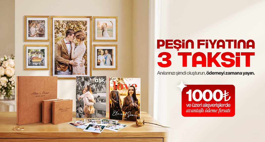 Gülümseten anları biriktirmek kadar, onları elinizde tutmanın mutluluğu da paha biçilemez. En değerli karelerinizi, yüksek kalite standartlarında fiziksel birer hatıraya dönüştürürken ödemelerinizi dert etmenize gerek yok. Hayalinizdeki foto kitaplardan şık çerçevelere kadar yapacağınız tüm seçimlerde, bütçenizi yormadan anılarınıza sahip olabilmeniz için peşin fiyatına 3 taksit imkanı sunuyoruz. Şimdi en özel fotoğraflarınızı seçin, ödemeyi zamana yayarak anılarınızı ertelemeden canlandırın.